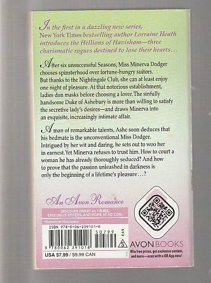 After six unsuccessful Seasons, Miss Minerva Dodger chooses spinsterhood over fortune-hungry suitors. But thanks to the Nightingale Club, she can at least enjoy one night of pleasure. At that notorious establishment, ladies don masks before choosing a lover. The sinfully handsome Duke of Ashebury is more than willing to satisfy the secretive lady's desires—and draws Minerva into an exquisite, increasingly intimate affair.