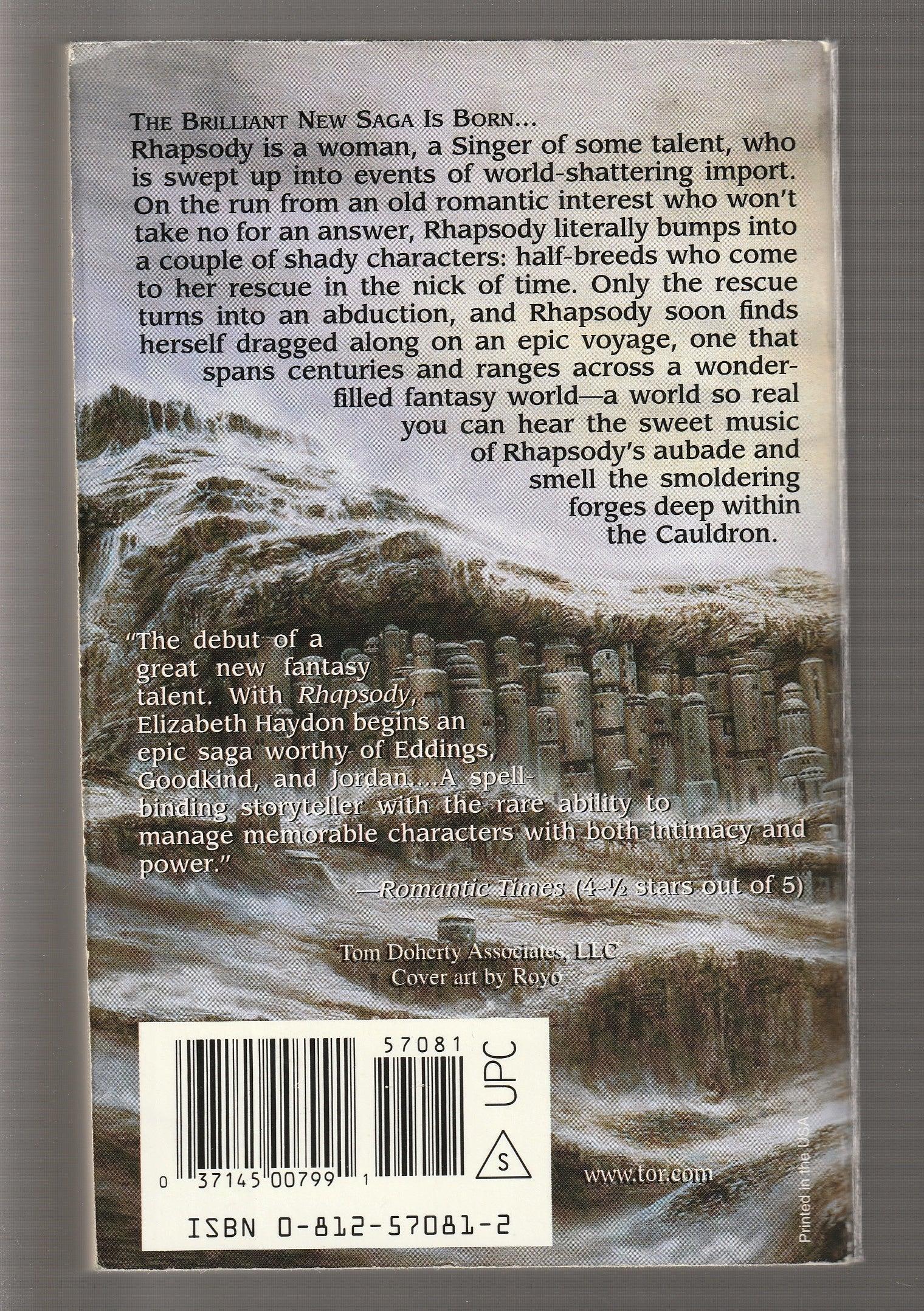 Rhapsody is a woman, a Singer of some talent, who is swept up into events of world-shattering import. On the run from an old romantic interest who won't take no for an answer, Rhapsody literally bumps into a couple of shady characters: half-breeds who come to her rescue in the nick of time. Only the rescue turns into an abduction, and Rhapsody soon finds herself dragged along on an epic voyage, one that spans centuries and ranges across a wonder-filled fantasy world-- a world so real you can hear the sweet music of Rhapsody's aubade and smell the smoldering forges deep within the Cauldron.