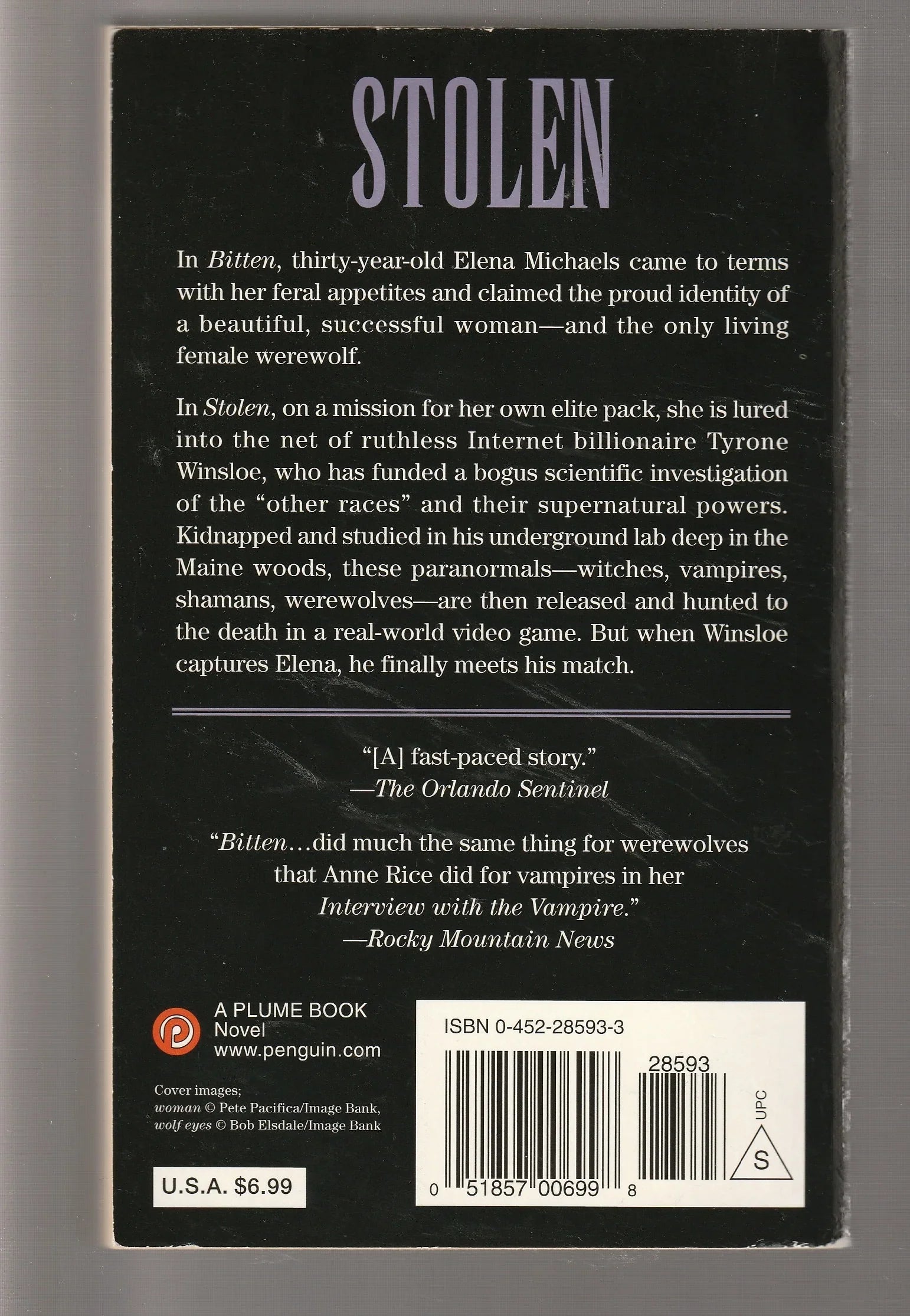 In Stolen, on a mission for her own elite pack, she is lured into the net of ruthless Internet billionaire Tyrone Winsloe, who has funded a bogus scientific investigation of the "other races" and their supernatural powers. Kidnapped and studied in his underground lab deep in the Maine woods, these paranormals - witches, vampires, shamans, werewolves - are then released and hunted to the death in a real-world video game. But when Winsloe captures Elena, he finally meets his match.