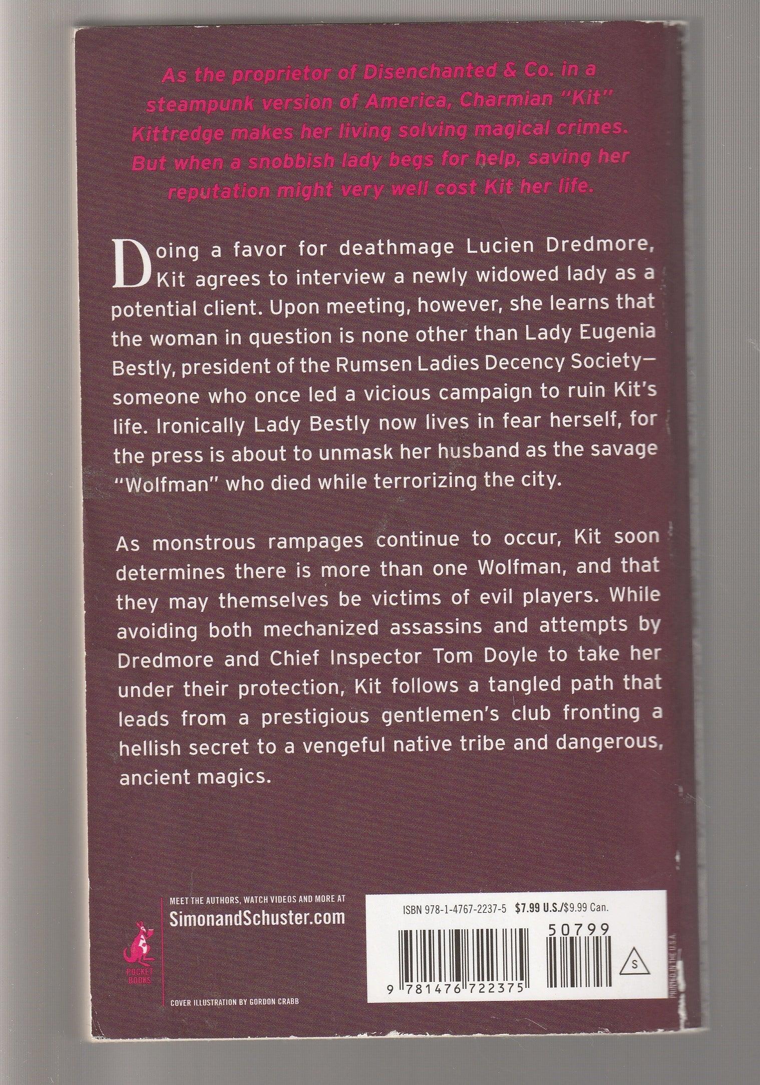 Doing a favor for deathmage Lucien Dredmore, Kit agrees to interview a newly widowed lady as a potential client. Upon meeting, however, she learns that the woman in question is none other than Lady Eugenia Bestly, president of the Rumsen Ladies Decency Society—someone who once led a vicious campaign to ruin Kit’s life. Ironically Lady Bestly now lives in fear herself, for the press is about to unmask her husband as the savage “Wolfman” who died while terrorizing the city.